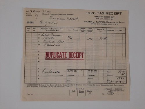 Oyster Bay Ny 1926 Tax Historic Local History Tappen Ebay